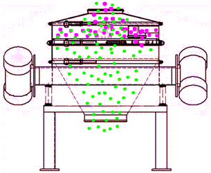 直排式振动筛利用振动电机利用其轴上下端的两组偏心块(不平衡偏心块)的相位角以及两台电机之间的交叉角度将振动电机的旋转运动变为水平、垂直、倾斜以及离心作用的多作用力重叠,再将这种作用力传递给筛面,从而达到筛分的目的。改变上下偏心块的相位角和重量,可以改变激振力的大小和物料的运动轨迹。